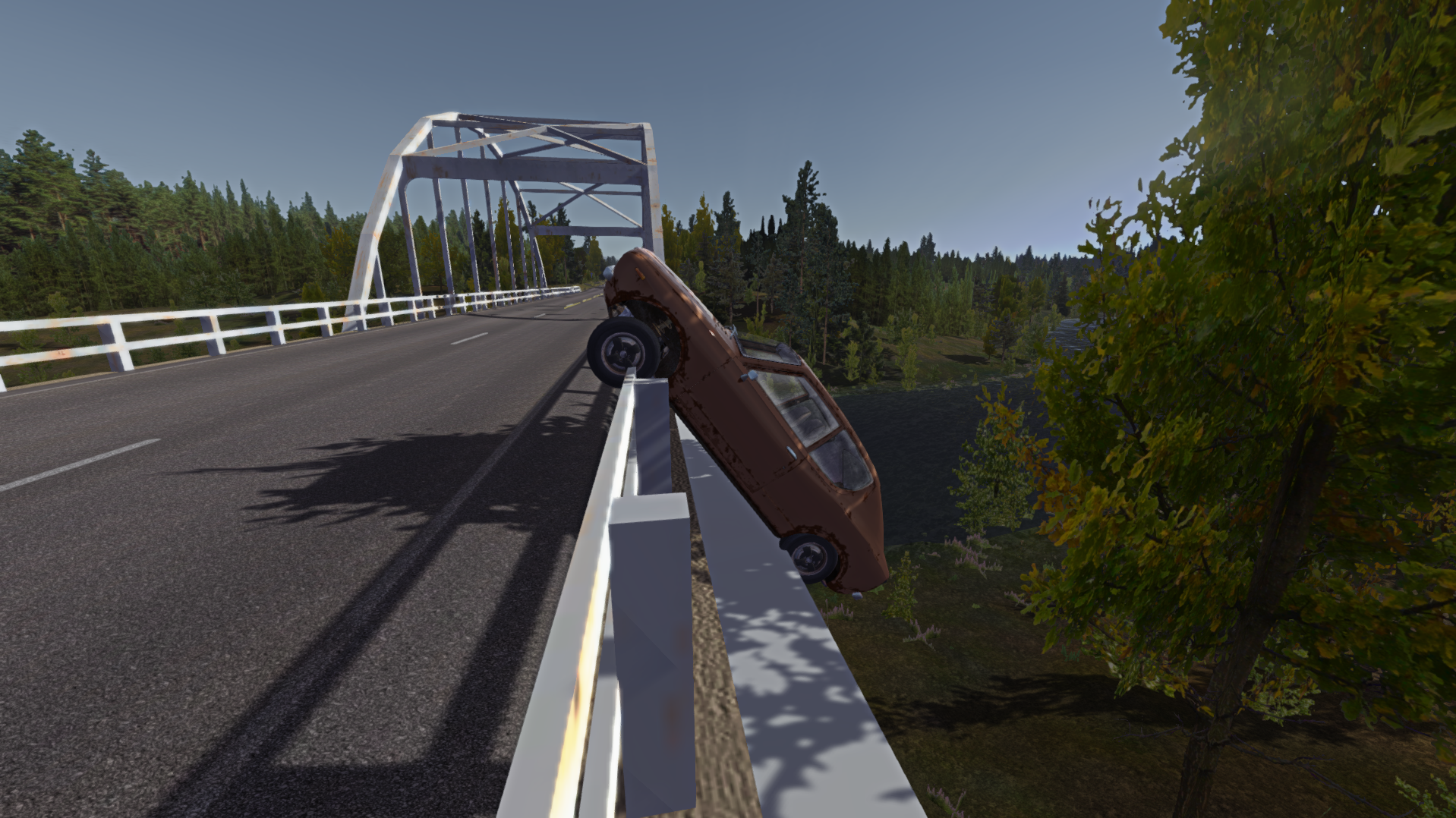 При попытке сделать красивый глайд по мосту что то пошло не так и трюк не удался. Вы к счастью выжили и в итоге остались простым наблюдателем с мыслью что же сейчас произойдет. Неизвестно осталась ли машина на ходу или нет. Как ее спасать решать уже вам. За секунду до аварии при наезде на "трамплин" моста уже был слышен звук отвалившегося глушителя, значит только царапинами машина уже не отделалась.
