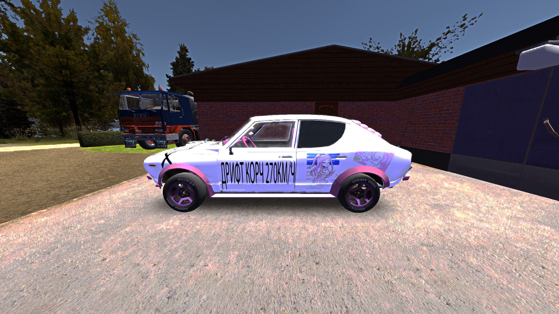 - Машина бело-розовая, очень мощная, есть турбина и 4 двери, розовые чехлы на сидения и установлены все фендера, нитро стоит в гараже, двойной карбюратор тоже там стоит;