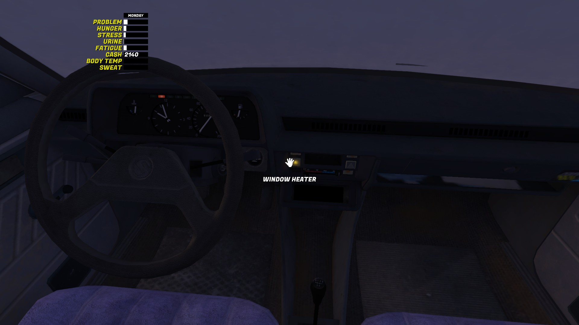 Оказавшись в салоне, следует уделить внимание климатической системе для очистки стекол от наледи. Панель управления включает в себя тумблер направления обдува (его необходимо перевести в положение «на окна», для точности можно использовать приближение камеры клавишей Ctrl), колесико регулировки температуры и черную кнопку мощности вентилятора с тремя режимами (Выкл, Низкий, Высокий). Рекомендуется включить обдув на максимум и дождаться прогрева салона. Начинать движение следует осторожно, не забыв снять машину с ручного тормоза, так как дороги покрыты слоем льда и крайне скользкие.