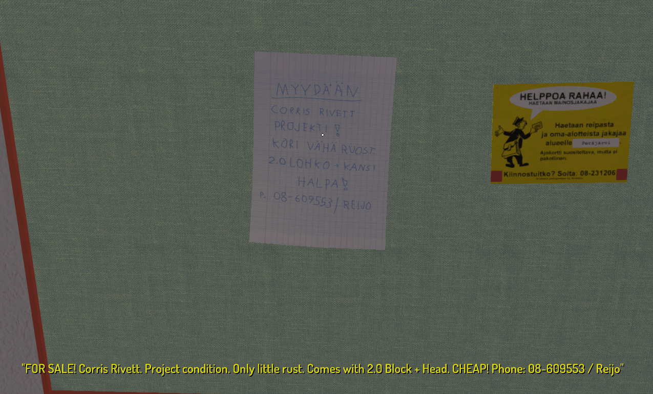Целью игры является сборка и тюнинг автомобиля Rivett. Информацию о его продаже можно найти на доске объявлений заправки. Необходимо вернуться домой и набрать на телефонном аппарате номер 08-609553. Следует дождаться окончания монолога продавца и характерного звука повешенной трубки — только тогда на карте появится маркер (дротик), и сделка состоится. Стоимость остова составляет 500 марок.