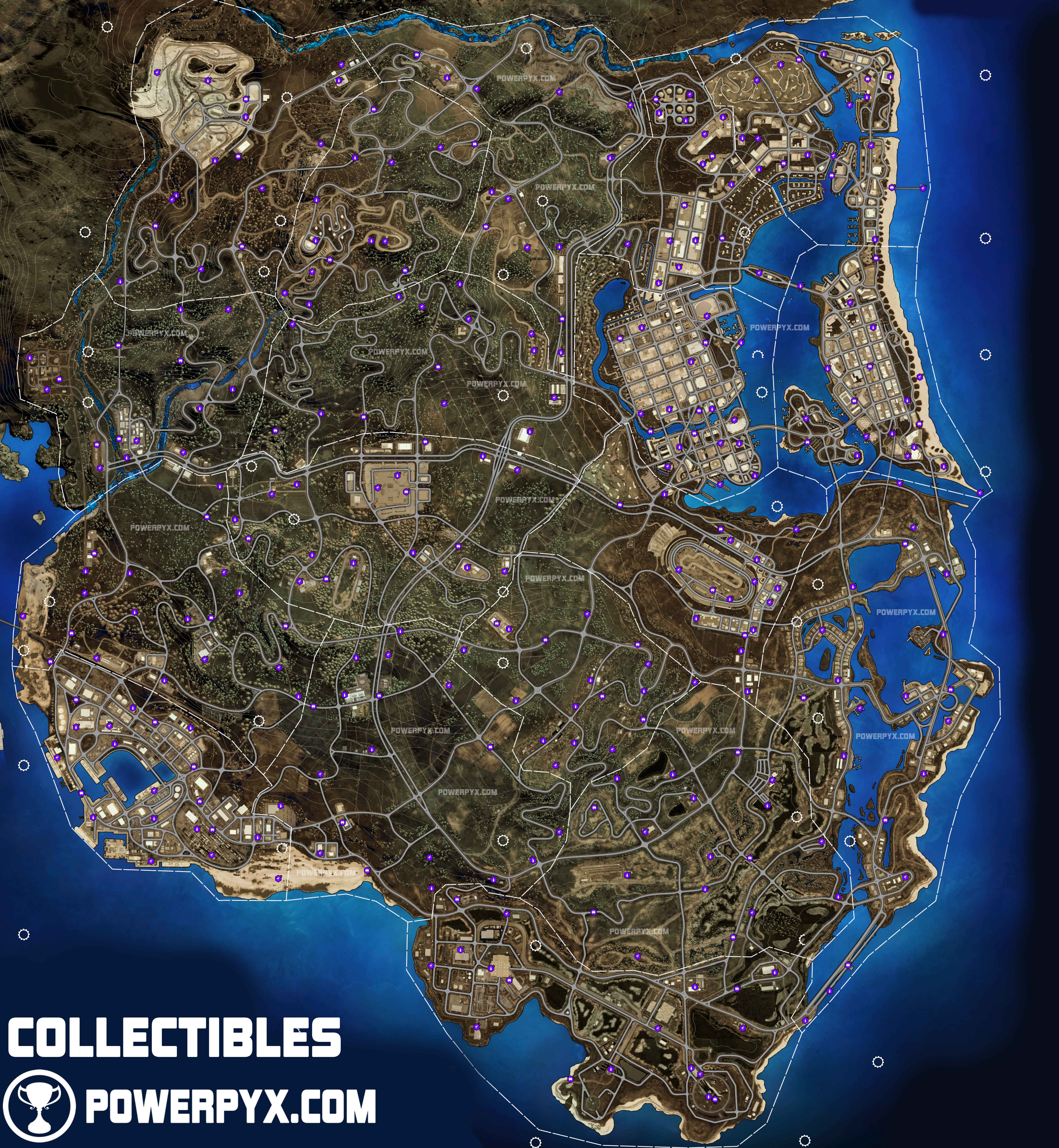 На данной карте показаны все скрытые объекты: рекламные щиты, наклейки, фламинго, радары, дрифты, прыжки.