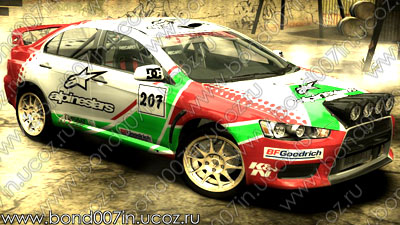 Автомобиль Mitsubishi Lancer Evolution X для Need For Speed Most Wanted. Под капотом Mitsubishi Lancer Evolution X находится двухлитровый четырех цилиндровый турбодвигатель мощностью в 280 лошадиных сил и с максимальным моментом в 422 Нм. Передача осуществляется пяти либо шести ступенчатой коробкой с парной системой сцепления Twin Clutch SST на систему полного привода. По части тормозной системы, ставка Mitsubishi Lancer Evolution X была сделана на фирму Брембо, которая оборудовала Mitsubishi Lancer Evolution X мощными 18 и 17-дюймовыми тормозными дисками и внушительными суппортами. Что касается интерьера Mitsubishi Lancer Evolution X, то здесь были присутствуют спортивные кресла Recaro, обшивка алькантарой, кожей и алю, а также мультимедийная система с винчестером на 30 гигабайт и семи дюймовым дисплеем. Кроме этого интерьер Mitsubishi Lancer Evolution X был наделен передними и боковыми подушками безопасности и специальным воздушным «мешком» для предотвращения повреждения колен водителя. Качественная модель из игры DirT 2. Мод Mitsubishi Lancer Evolution X для NFS Most Wanted заменяет машину Mitsubishi Lancer Evolution 8