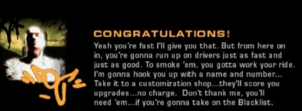 Да вы быстры, я отдам вам его. Начиная отсюда вы сможете довольно быстро и хорошо догнать водителей. Чтобы их обогнать вам придётся отработать гонку. Я прицеплю название и номер. Возьмите всё это в персональном магазине. За обновления они будут бесплатно давать вам баллы. Не благодарите меня. Они вам ещё понадобятся если вы не попадёте в чёрный список.