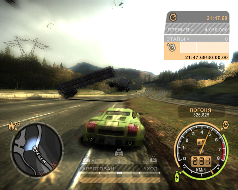 Я проходил 30-ти минутную погоню, еле как прошёл, 10 минут надо с 5 уровнем ездить,а всё остальное с 6 уровнем. Спрятался на стройке в Рокпорте. Как только набрался уход от копов-вылетело из игры. Я уже подумал, что придётся лицензионный покупать, как вспомнил, что можно попробовать на первом Most Wanted, который я устанавливал. Он был без музыки и видеороликов, поэтому я установил второй, а этот то и оказался ещё хуже. Ну вот пришлось ещё раз проходить. В первый раз я уходил по автостраде 1-го города, а во второй раз начал в первом, а больше половины проходил на автостраде Рокпорта. Прошёл и из игры не вылетело. А в первый раз у меня был такой случай. Ехал по автостраде и вдруг вылетел вертолёт. Он пытался меня раздавить и врезался прямо в тягач с прицепом. Прицеп оторвался.