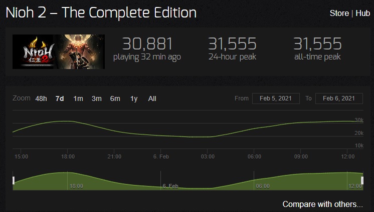 По данным сайта Steam DB, число одновременно играющих игроков в недавно вышедшей игре Nioh 2 на самом деле было больше, чем в оригинальной игре.