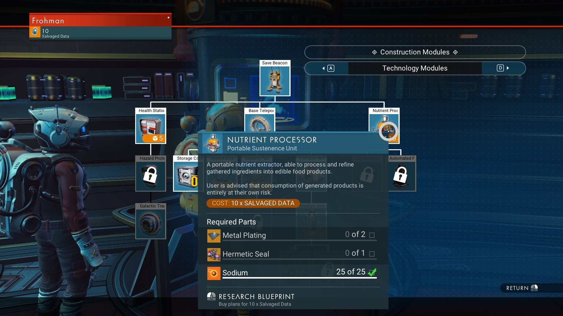 Чертеж устройства стоит 10 единиц уцелевших данных (salvaged data). Собрать уцелевшие данные можно на различных планетах: используя свой визор, отыщите иконку, похожую на сигнал Wi-Fi – под ней будет лежать технологический модуль, до которого можно докопаться ландшафтным манипулятором. Найти эти модули не так уж и трудно, однако каждый из них содержит всего одну единицу уцелевших данных.