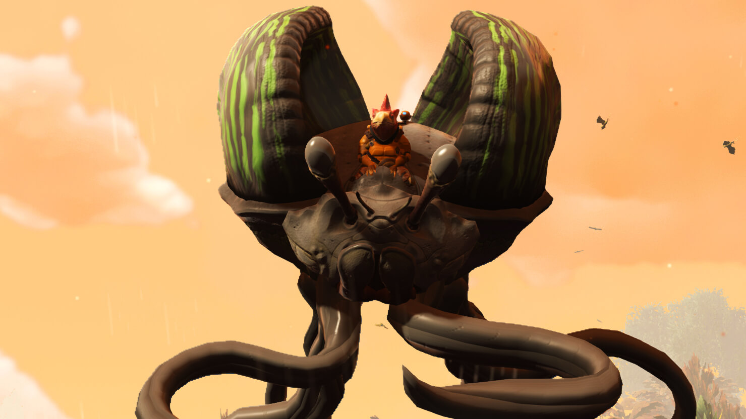 Существа средних и больших размеров, однако, всецело доступны для верховой езды. Можно приручить даже летающих животных вроде этого пугающе огромного, плавающего в воздухе краба, с которым мне удалось подружиться. Ии-хаа!