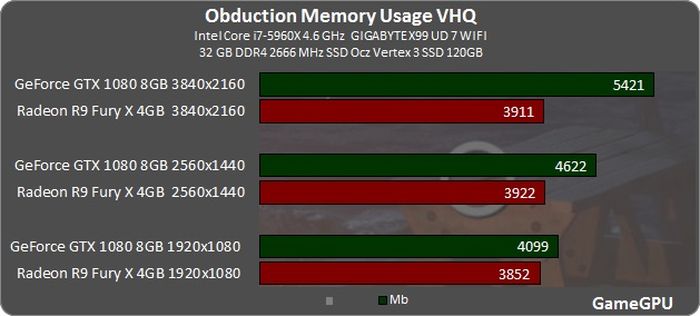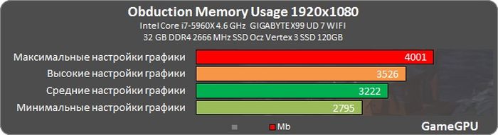 Как мы видим, при различных установках качества объём потребляемой оперативной памяти в Obduction находился в пределах 2800-4000 мегабайт.