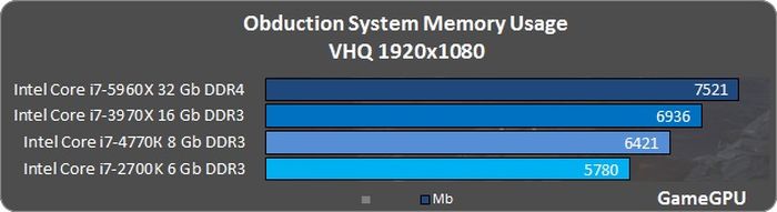 При наличии системы с 6-мя гигабайтам Obduction потреблял все 5.8 гигабайт ОЗУ. При наличии системы с 8-ми гигабайтами потребление ОЗУ всей оперативной памяти составило 6.4 гигабайта. С системой на 16 гигабайт потребление общей памяти составило почти 7 гигабайт. И при наличии 32 гигабайт оперативной памяти система потребляет 7.5 гигабайта ОЗУ.