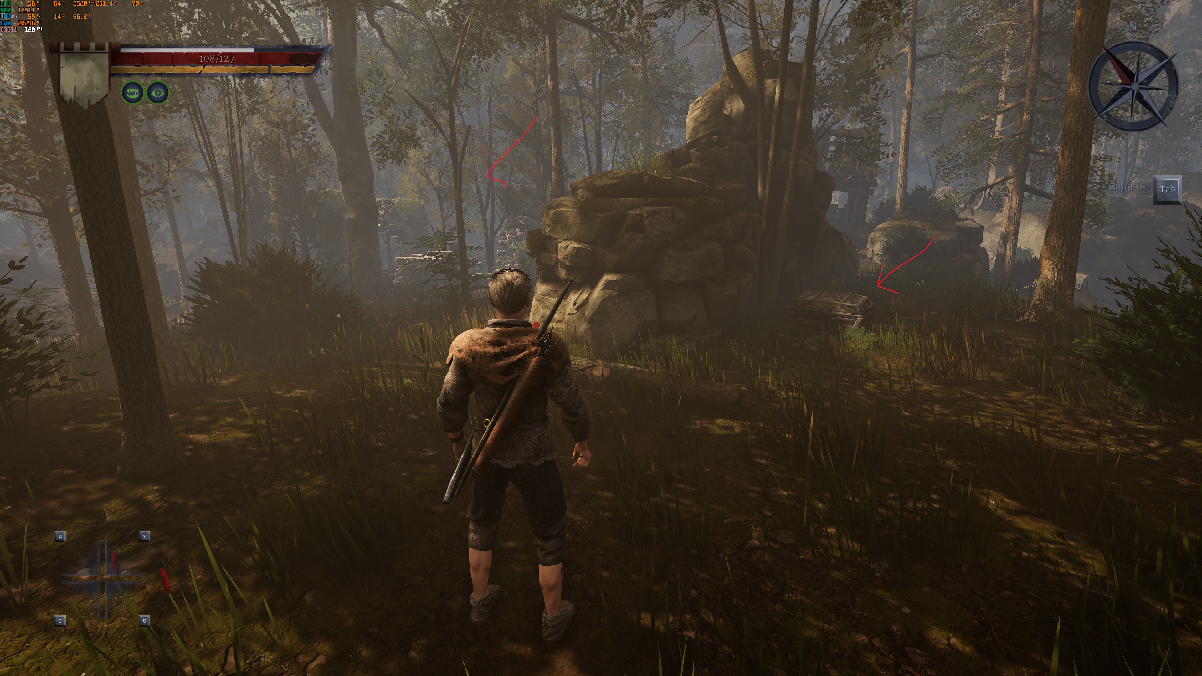 А вот лук с уроном 35( деревянный, или в сундуке взял, или кого отпинал , не помню как достал), и здоровых скитальцев (вроде название), норм домажит, они огромные и застревают везде, по голове 8 стрел и готов, и 450 опыта с него.