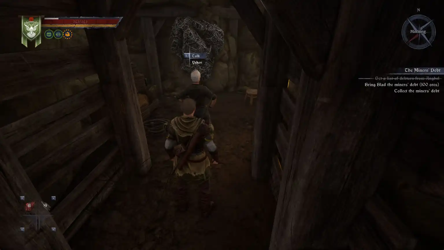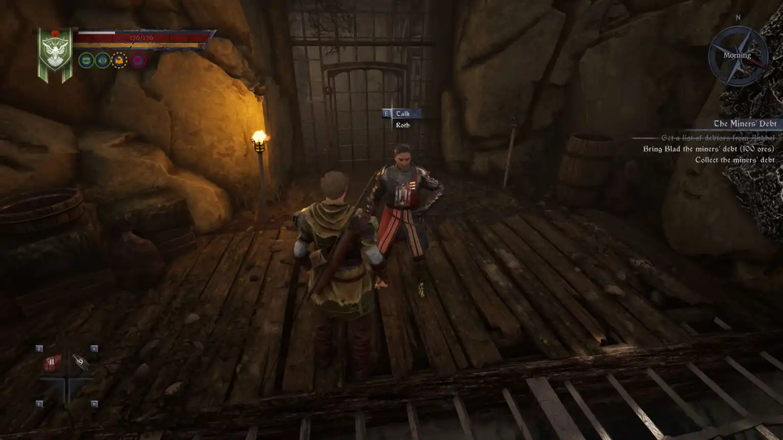Поскольку собранного золота не хватит для квоты, придется помочь шахтеру Торсту, сидящему в пещере. Ему нужна качественная кирка. Изготовить ее может кузнец Корф, но ему потребуется Базальтовый слиток. Этот ресурс лежит в тупике на верхнем уровне шахт (перейти мост, спуститься, налево и направо в тупик). Передав слиток кузнецу и получив инструмент, следует отнести его Торсту, подождать завершения работы и забрать 75 самородков. Полная сумма сдается Бладу, а обновленный список — Анхелю.