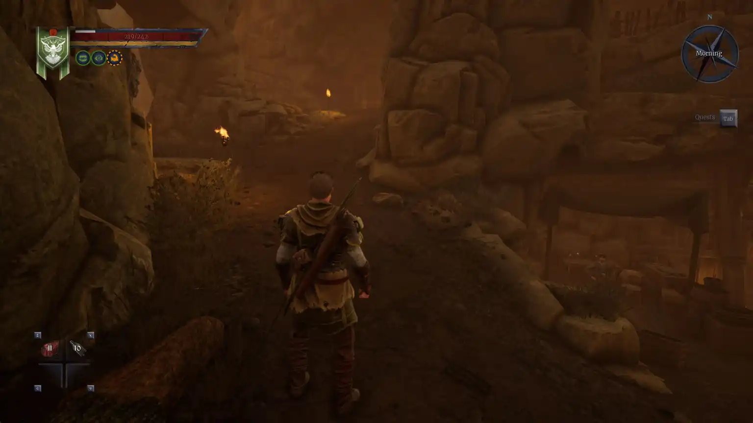 Внизу обитают опасные звери и растут Пористые Пещерные Грибы (нужно собрать 8 штук для Лекаря). Вернувшись наверх, можно попытаться отравить Фина (или персонажа Лин, в зависимости от контекста), но это может не сработать. Альтернативный и надежный способ устранения — несчастный случай. Необходимо найти валун, расположенный напротив хижины с тайником Винсента (путь прямо и вниз от кузнеца, затем направо). Столкнув камень вниз, герой устранит информатора Фина.