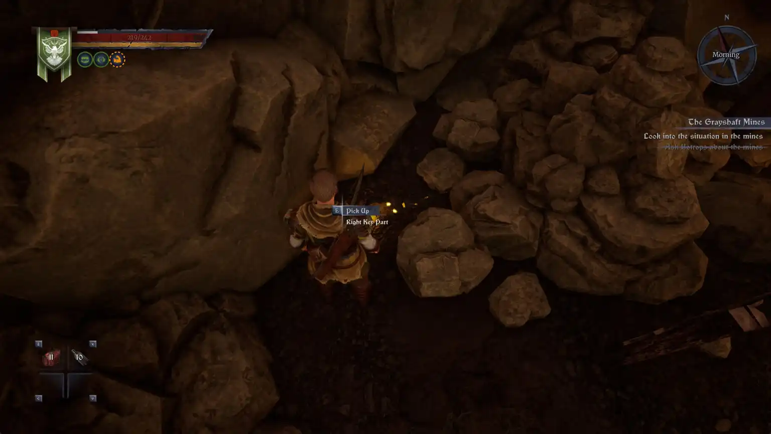 - Ключ: В западной части шахты, у деревянного забора и скал, спрятаны две части сломанного ключа. Для поднятия камня, скрывающего левую часть, потребуется 20 единиц Силы.