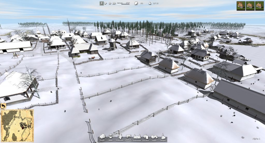 Текущая версия игры содержит 26 основных зданий, и три карты. Здесь есть все, чего можно ожидать от градостроительной игры: земледелие и животноводство, моделирование дорог, динамическая смена времен года, базовая торговля и т.п. Многое еще в планах и будет добавляться в игру постепенно (дорожную карту можно посмотреть на сайте).