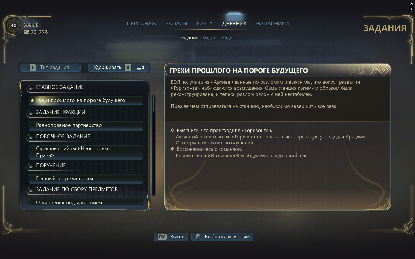 В котором нужно убедить глав "Тёти Космос" и Ордена Вознесения прекратить вражду и работать вместе. Обеим главам решил их проблемы, провёл их переговоры, на текущий момент висит "Захватите архив и передайте его союзникам" - по завершению анализа в архиве, отдать Калькадуцей Ордену и "Тёте Космос".