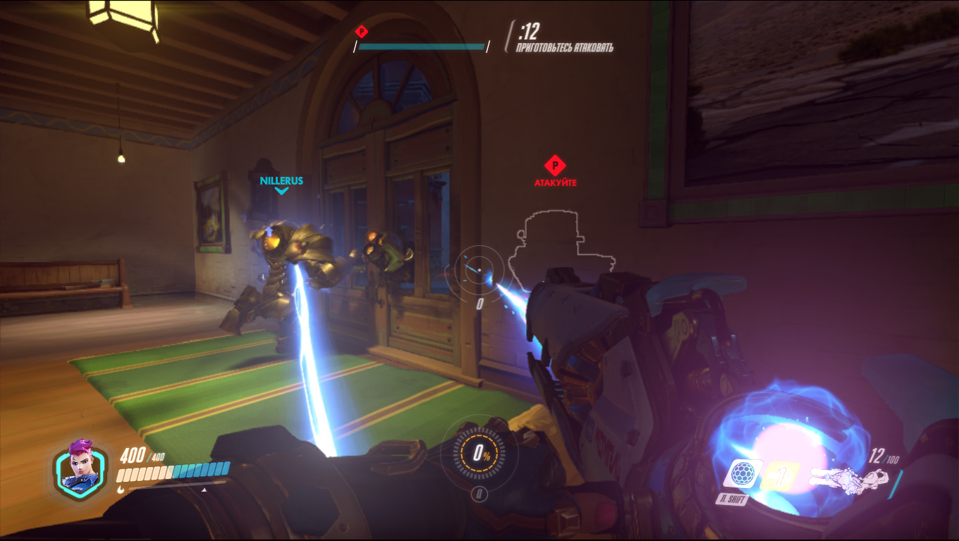 У каждого персонажа помимо обычной атаки есть ее дополнительный, усиленный вариант. Например, у Солдата-76 — залп ракетами, бьющими по небольшой площади. Также у персонажей есть два умения и одна ультимативная сверхспособность. Нельзя сказать, что они могут кардинально изменить ход боя, но обычно это действительно мощное подспорье. Например, лучник Хандзо может выстрелить духом дракона, убивающим даже сквозь стены. Бастион может превратится в танк, а российская Заря — вызвать гравитонный импульс, похожий на локальную черную дыру.