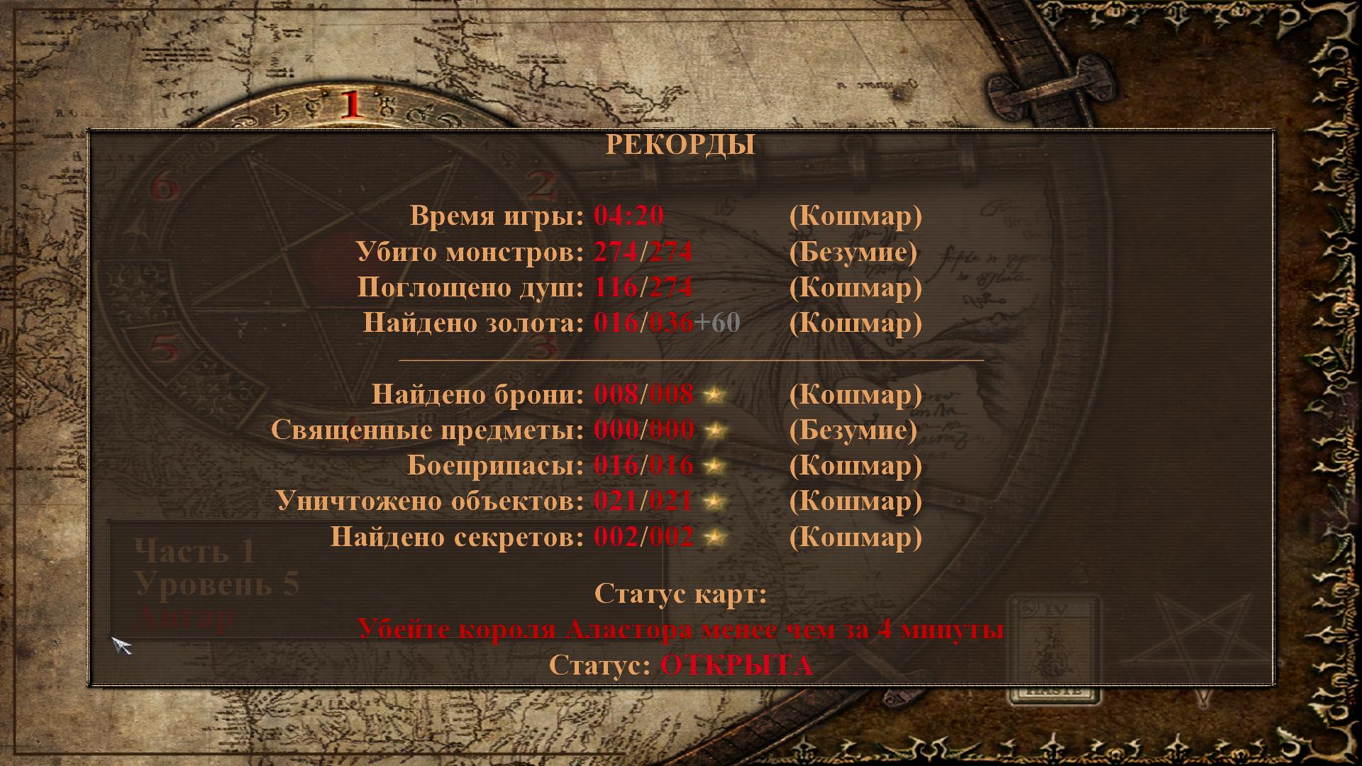 Если кто-то не знает этого прикола, типа как, да не реально за 5 минут уровень пройти на 5 звезд, то говорю: когда начинал играть, оставил рекорды с Кошмара, поэтому только напротив колонки где стоит время в скобках написано Безумие. Короче чтоб не было путаницы, в следующий раз начну с нуля, без других рекордов. А, и фотать лучше будем не в меню, а в игре! Ок?