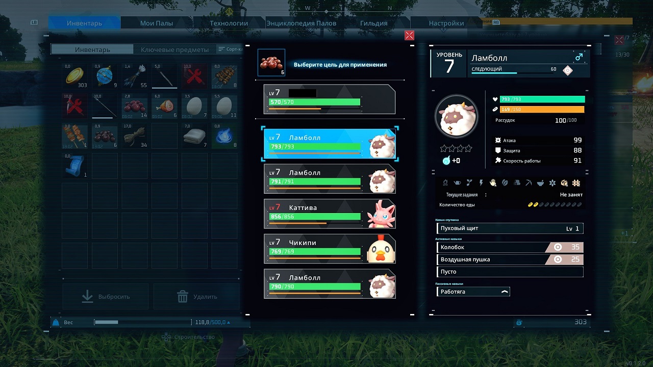 Позже, когда вы разблокируете специальный предмет, вы сможете поместить еду в контейнер в своем инвентаре. Этот предмет позволит персонажу и его Палам автоматически есть, как только они проголодаются или им понадобится пополнить запасы HP.