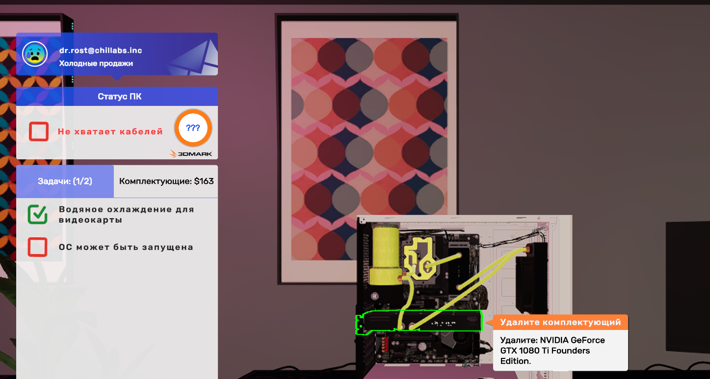 попробывал поиграть и снес ее нах., чтобы не портить себе нервы. То процессоры с материнками которые в реале работают прекрасно в этом наборе забагованных скриптов несовместимы, то оперативки с материнками несочитаемые хотя в реале все прекрасно работает. В итоге по нескольку раз покупаешь процессоры и оперативки в надежде, что она в этой глючной игре окажется совместима. А про забагованные кривые скрипты- подсказки которые даже если отключишь все равно сами включаются это полный писец.... Простое задание поставить водянку на материнку тупо НЕВОЗМОЖНО ВЫПОЛНИТЬ так как снятие видеокарты с водянкой тупо очередной забагованный скрипт-подсказка. Криворукий скрипт-подсказка показывает, что нужно снять видеокарту, но не дает возможность сперва слить хладоген с резервуара так как тычет именно на видеокарту, а без слития хладогента видеокарту НЕВОЗМОЖНО снять и в итоге материнку снять без снятия видюхе нельзя и отказаться от задания тоже невозможно. И даже кнопки в вверхнем левом углу "отойти от стола" просто НЕСУЩЕСТВУЕТ. Единственный способ отойти от стола это тупо забить этот набор багов называемых игрой через диспечер задач так как кнопки быстрого доступа не работают. Но при повторном входе в этот набор багов при нажатии "продолжить" в главном меню это глючное задание висит в почте и удалить его из почты или отказаться от него НЕВОЗМОЖНО. С этим же багом походу столкнулся не я один и он описывается выше, а у меня скрин этого глючного задания.