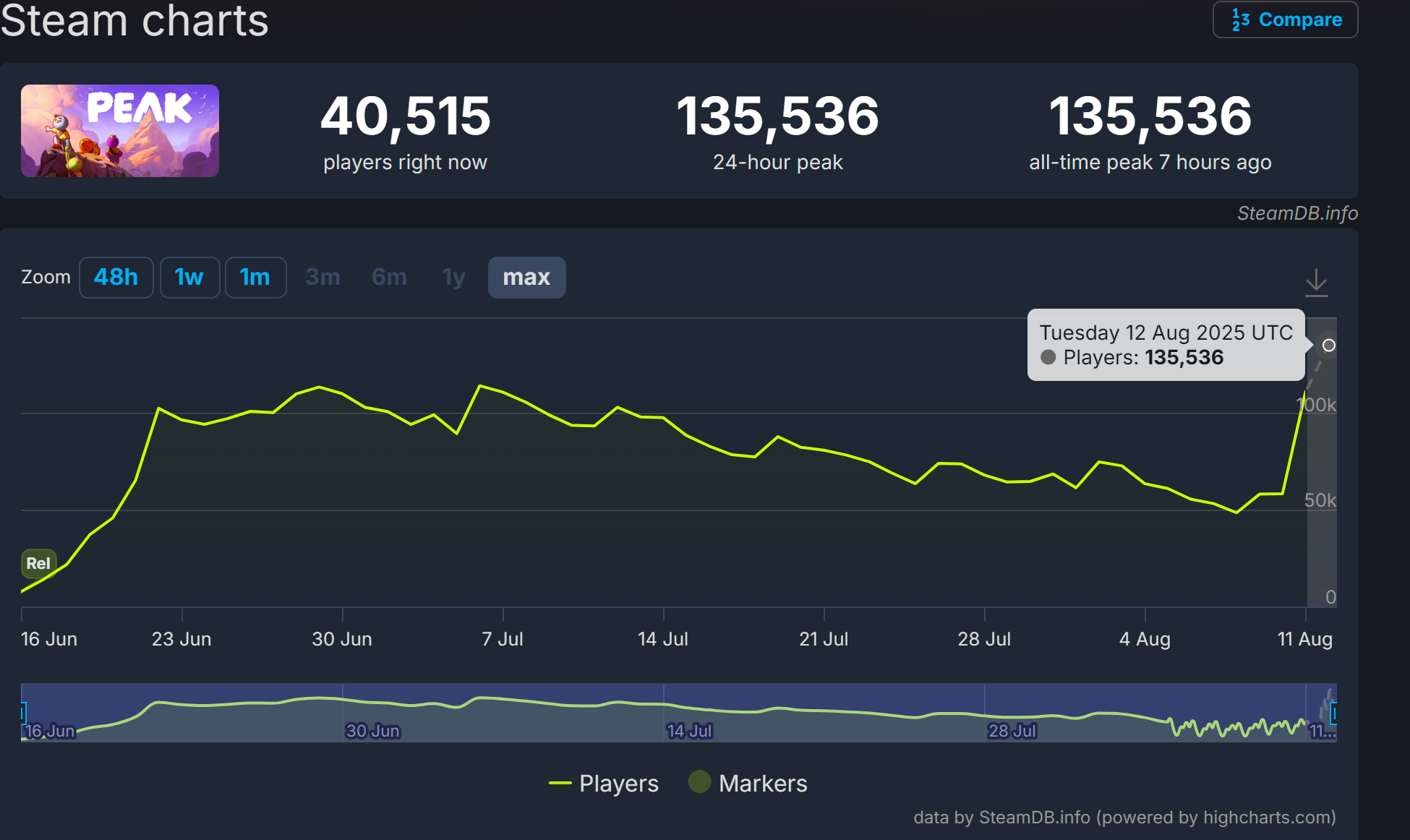 Патч добавил в игру пустынный биом, динамит, пушки и другие элементы геймплея. По данным SteamDB, в ночь на 12 августа в Peak одновременно находилось 135 536 пользователей, что превысило прошлый максимум от 6 июля (114 492 игрока).