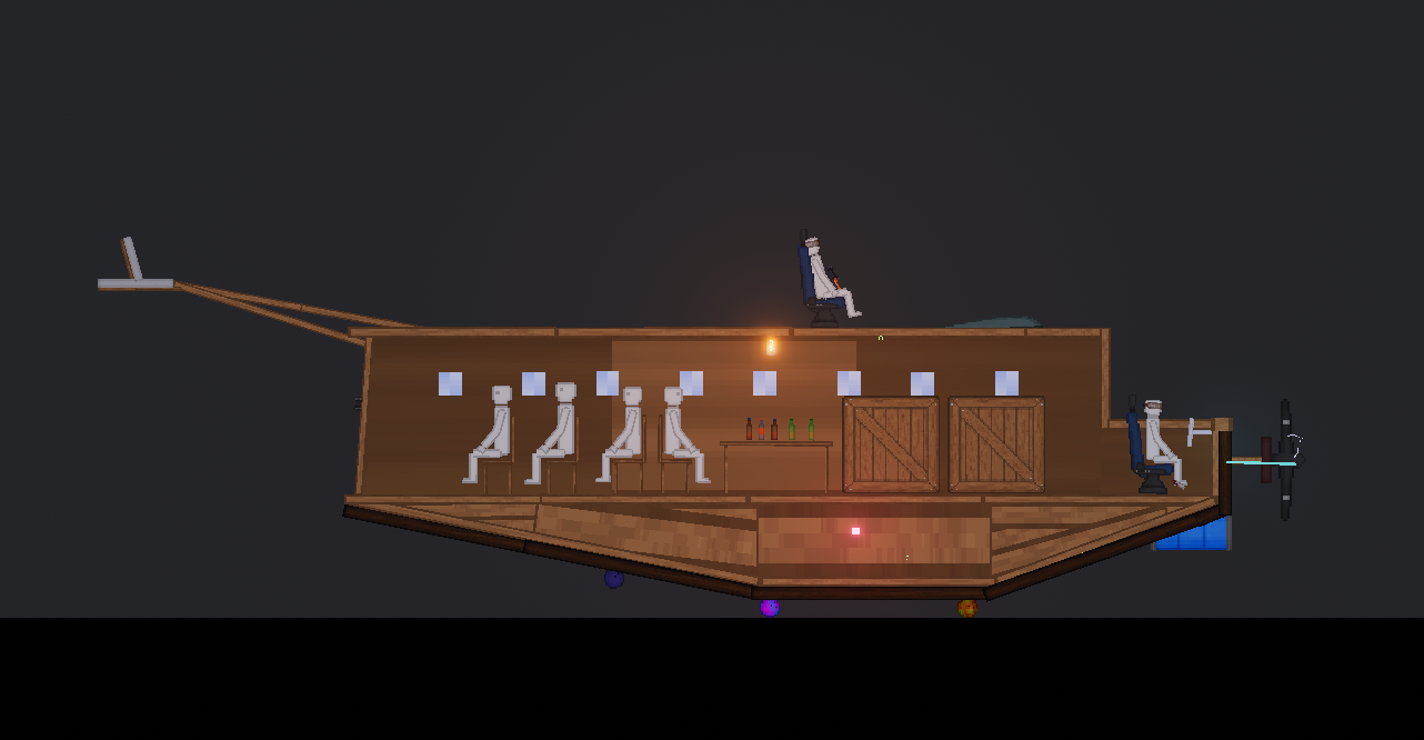 Это биплан из дерева. Экипаж: 6 человек (4 пассажира, 1 пилот, 1 защитник наёмник).