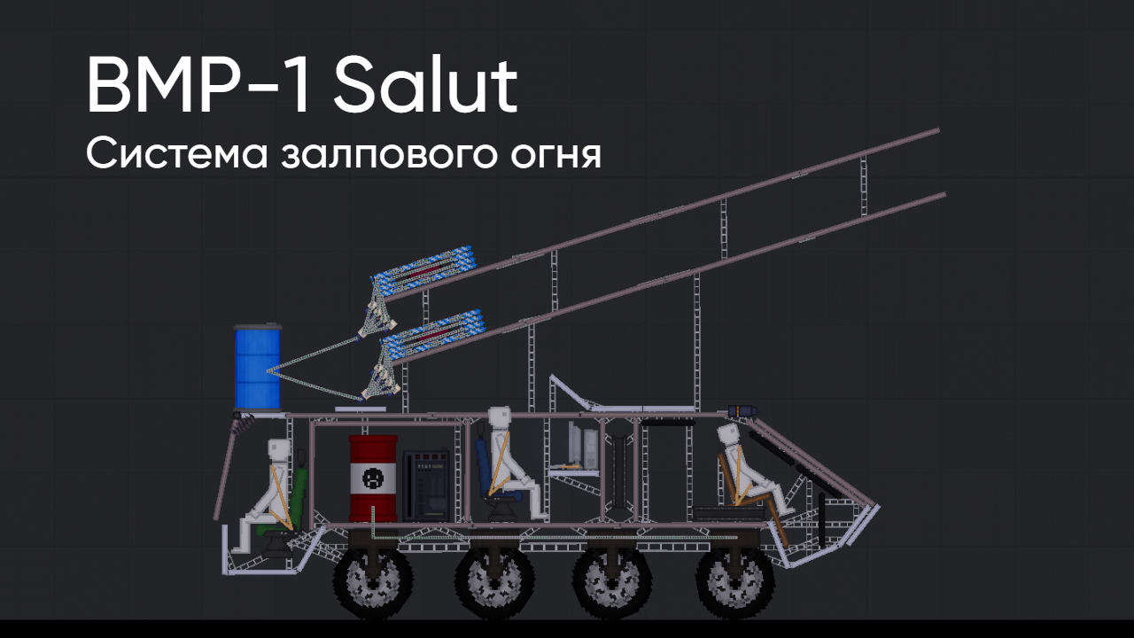 Очередная модификация вымышленной Бмп-1. Демонтаж башни позволил установить двухсекционную систему для запуска комбинированных зарядов. Заряды состоят из множества мелких ракет начинённых взрывчатым веществом и одним фугасным зарядом в центре. Заряды детонируют на расстоянии чуть выше земли но за счёт последовательного подключения заряды, находящиеся в хвосте снаряда, детонируют первыми, ускоряя тем самым заряды находящие в носовой части, что даёт необычный эффект взрыва, позволяющий эффективно поражать живую силу противника.