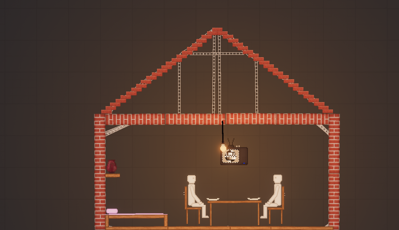 Полностью разрушаемый но все же крепкий, как в те временна дом, в доме присутствует некая атмосфера старых времен, черно белая картинка на телевизоре, жёлтая советская лампочка, стулья и стол которые держатся уже 5 лет и не смотря на это они как новые, старые кирпичные стены, старинная ваза на полке.