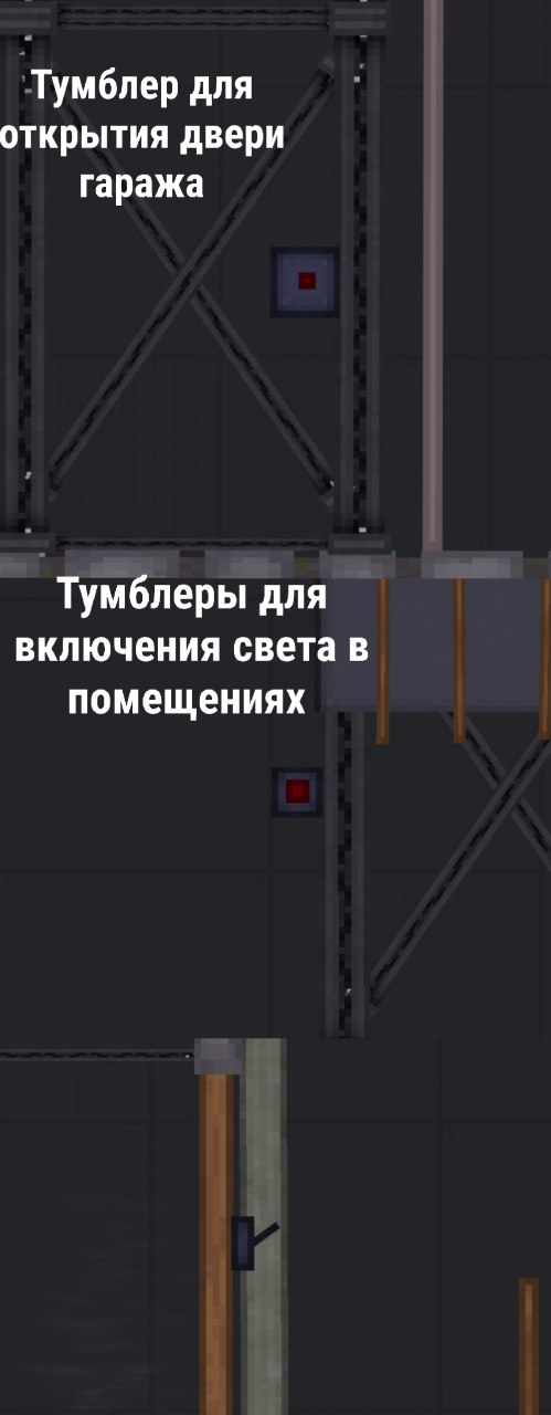 Представляю вашему вниманию уютный домик с гаражом. Внутри дома мебель и различный предметы, в гараже имеются инструменты. Также через дом и гараж протянуты трубы и есть котел(который лучше не выключать, а то он нагреется и будет сюрпрайз)). Рядом с домом имеются уличные фонари.