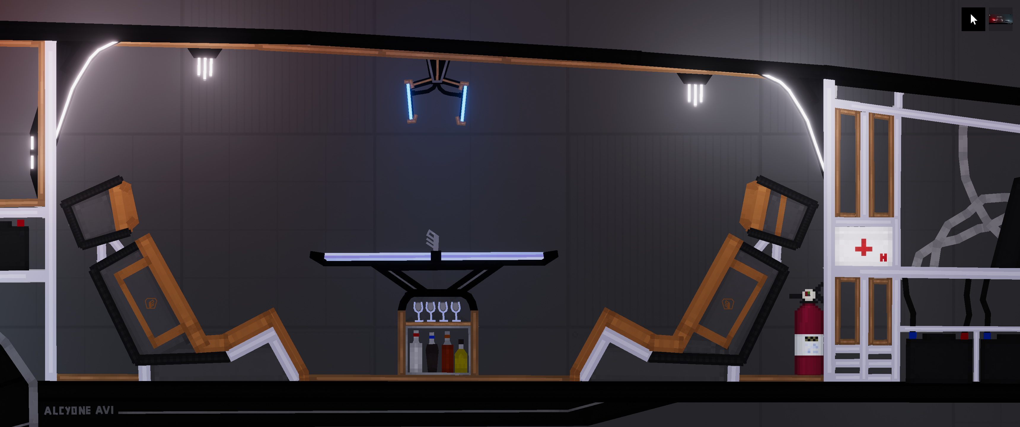 Пространство для пассажиров находится в центре, в ходе разработки его длина была увеличена и стала на 45 сантиметров больше чем у Alcyone AVI-8. Внутри находятся 4 пассажирских кресла, по середине расположен мини-бар на который интегрирован стол с эмблемой подразделения Alcyone, (Такая же эмблема установлена спереди и изображена на логотипе подразделения.) Над столом находится 2 дисплея, в передней части присутствует шкаф для верхней одежды а так же аптечка. Не стоит забывать и о багажном отделении, к которому пассажиры имеют доступ изнутри.