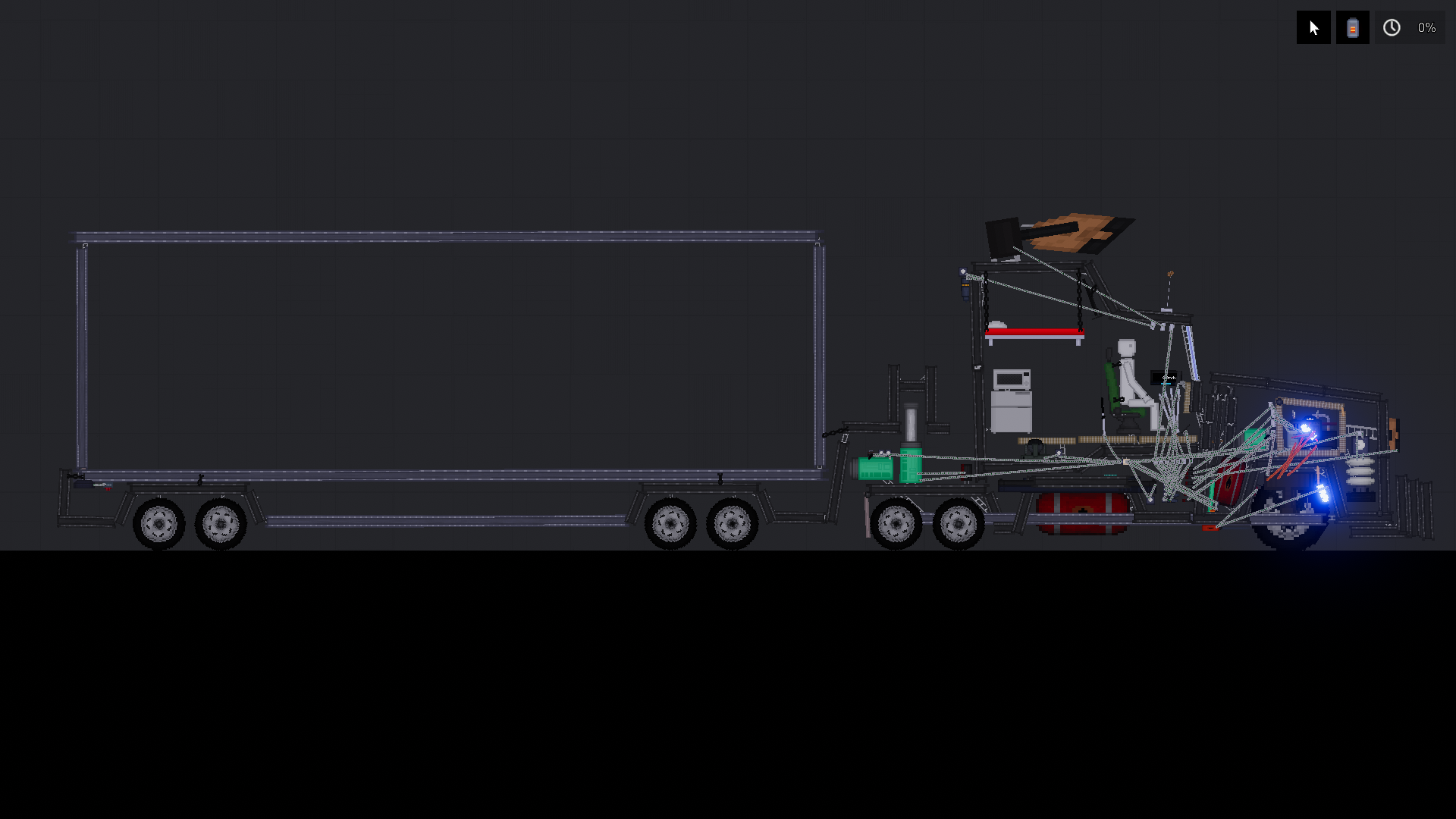 Автомобиль оснащен полнофункциональной механической коробкой передач. Она включает три скорости для движения вперед и одну заднюю передачу. Это позволяет полностью контролировать разгон и поведение машины на разных скоростях. Главной особенностью грузовика является система безопасности «Кокон» (Cocoon). При критических повреждениях или по команде водителя кабина мгновенно отсоединяется от шасси с двигателем и катапультируется, спасая жизнь пилота. Благодаря мощному двигателю и облегченной конструкции грузовик демонстрирует впечатляющую динамику. Без прицепа он способен разогнаться до 300-400 километров в час. Интерьер кабины тщательно проработан. Хотя внешний вид конструкции может показаться сложным, внутри водитель имеет доступ ко всем необходимым рычагам и кнопкам. Каждое управляющее воздействие выполняется вручную, что обеспечивает полное погружение в процесс вождения.