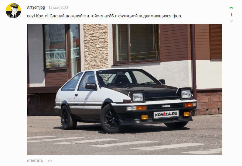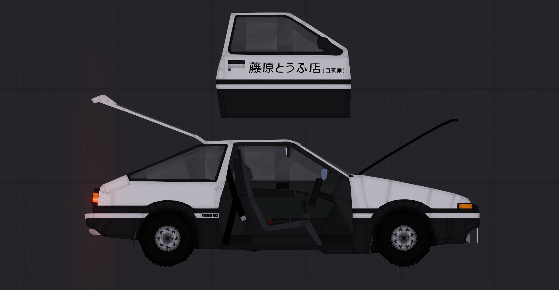 Toyota AE86 Sprinter Trueno - Хетчбэк компании Тойота входящий в общее обозначение автомобилей AE86, входящие в свою очередь в обозначение автомобилей Corolla пятого поколения. Это реплика Toyota AE86 Sprinter Trueno которую водил главный герой манги/аниме Initial D.