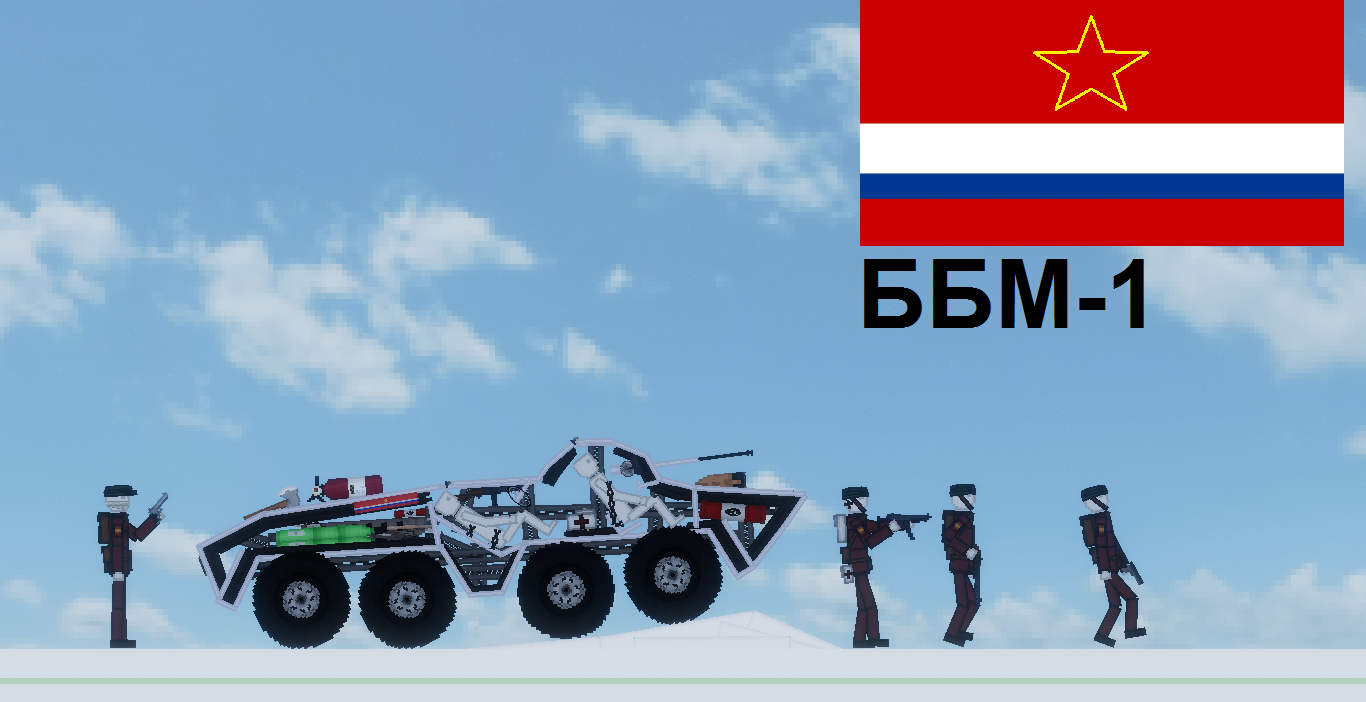 ББМ-1 (Бронированная Боевая Машина). Бронетехника федерации Р-КС, созданная для поддержки пехоты на суше и на воде. Имеет 30m пушку с автоматическим выстрелом. Против возгорания есть огнетушитель, топор для обороны или же разлома обломков, чтобы вытащить товарища к примеру, аптечка для оказания помощи, и ППШ для самообороны если ББМ будет выведен из строя. Имеет броню, но без неё легко пробиваем, может плавать на воде. Есть фары, а также руль для управления танка и управления дулом. Может преодолевать маленькие и небольшие препятствия, по типу кучу кирпичей на дороге после взрыва здания. Имеется маленькая подвеска колес. Эффективен в бою на поле при пехоте против средних танков, но пробивается 120m пушкой под определенным углом. Экипаж из 2 людей.