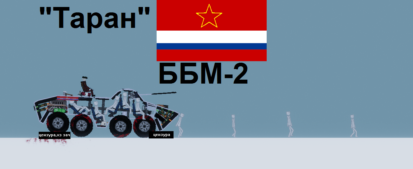 ББМ-2 (Бронированная Боевая Машина). Бронетехника федерации Р-КС, модифицированная копия ББМ-1, созданная для поддержки пехоты и перевозки на суше и на воде. Эту модель прозвали "Таран", как при большом скоплении врагов, можно ехать просто на таран. Имеет 120m пушку. Против возгорания есть огнетушитель, топор для обороны или же разлома обломков, чтобы вытащить товарища к примеру, аптечка имеется у каждого экипажа для оказания помощи, и дробовик с пистолетом для самообороны если ББМ будет выведен из строя. Имеет мощную броню броню, но без неё легко пробиваем, может плавать на воде. Есть фары, а также руль для управления танка и управления дулом. Может преодолевать средние и небольшие препятствия. Имеется маленькая подвеска колес. Эффективен в бою на поле при пехоте против средних танков и более немного. Экипаж из 5 людей. И он хорошо таранит людей.