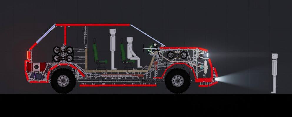Впервые решил выложить свою одну из самых удачных машин на мой взгляд, модель со своими недостатками, делал для себя. Машину можно сломать/разбить/разобрать по частям, полностью разрушаемая. Полный привод, фары, противотуманные фары, система АБС против резкого торможения и возникновения возгорания колес, 3 мощных двигателя, система охлаждения, так же датчик мощности. Машинка относительно медленная - но едет, если что-то не нравится можно видоизменить или сделать мощнее.