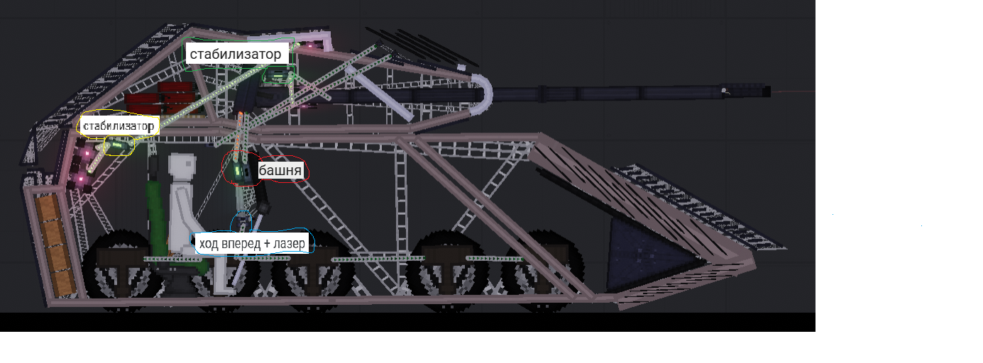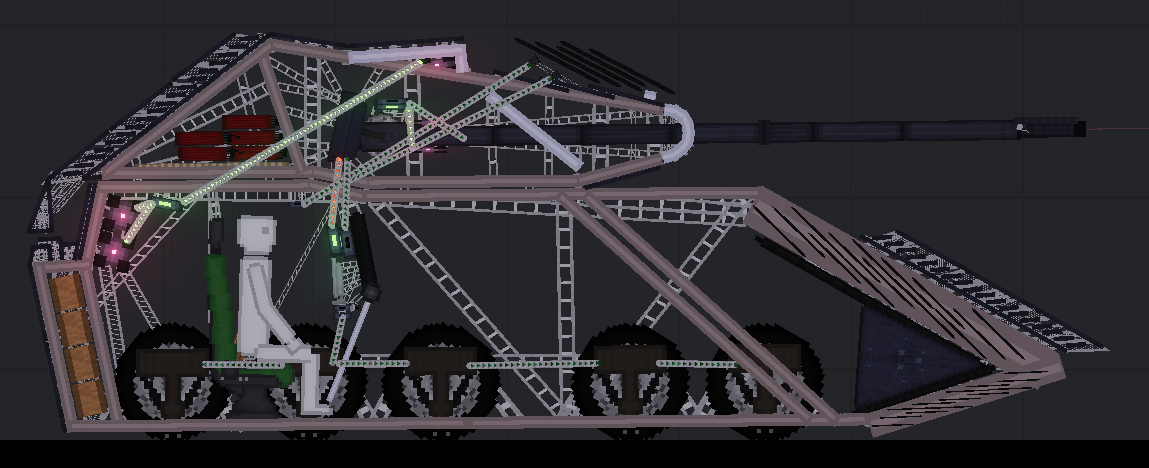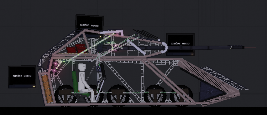 "Окантовку" для танка лучше делать не из таких металлических балок, а из Metal Rod во вкладке Melee (как говорит Фрозен в своëм гайде), которые ты уже используешь здесь.