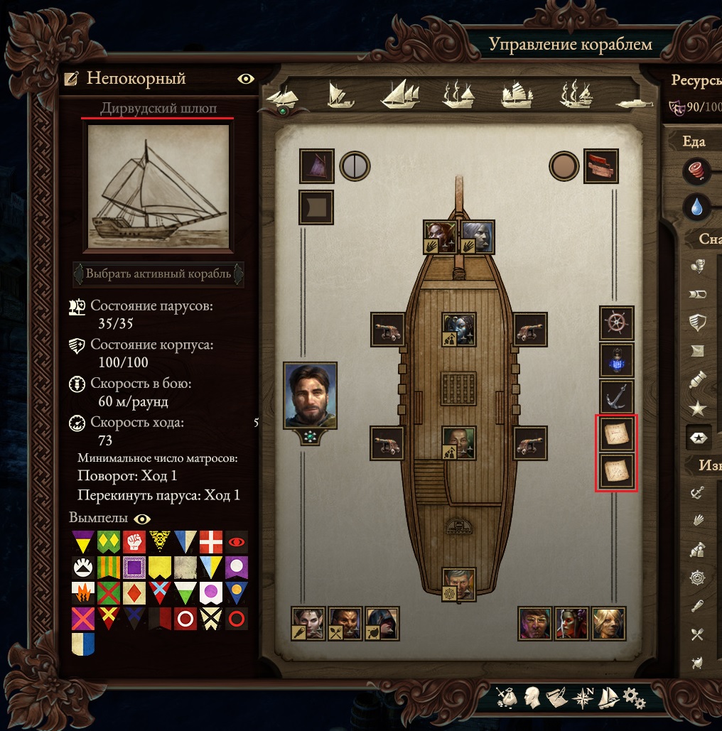 Просто перемести в слот со звездой, там где управление кораблём (пушки, матросы и т.д.), тоже самое касается и парусов, обшивки, фонарей и т.д.