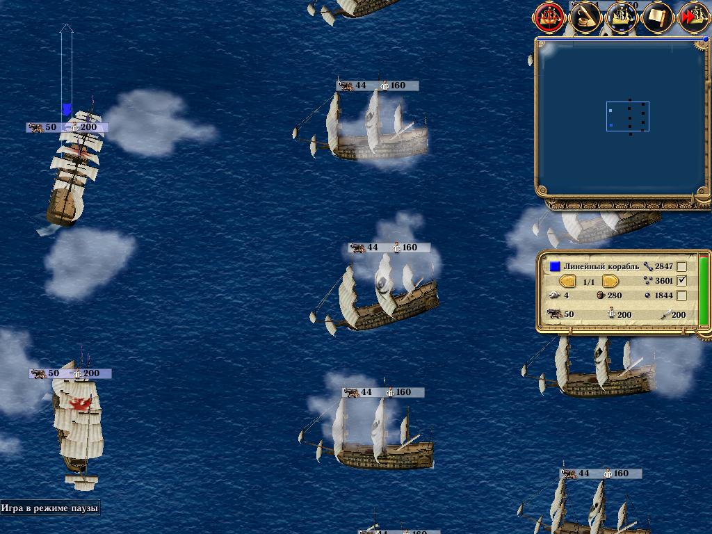 В начале боя линкоры поворачиваются примерно на 90 градусов и расплываются в противоположные стороны друг от друга. Пиратские корабли оказываются при этом для одного с левой, а для другого с правой стороны. Пираты разделили свой флот: за одним линкором пошло 6, а за другим 3 корабля. Картечью веду отстрел экипажей пока на ближайших кораблях не остается минимальные экипажи (по 12 человек). На абордаж не иду, т.к. это ниминуемо приведет к тому, что мои корабли тоже огребут. Немного меняю курс, только немного, так, чтобы и другие вражеские корабли теряли экипаж от обстрела. Когда у каждого моего корабля с обоих сторон идут галеоны с мин.экипажем настает время поворота и первого абордажа. Заранее (чтобы не вылететь с карты) поворачиваю в сторону, сталкиваюсь и мгновенно беру на абордаж галеон, на котором было 12 человек. После этого маневра у противника стало на 2 корабля меньше, а мои корабли все же получили по одному залпу.