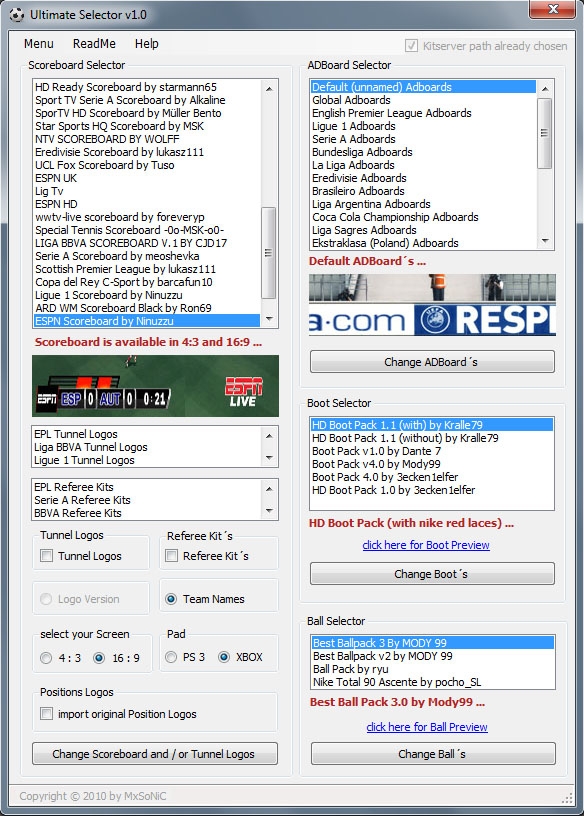 Новые оформления каналов, формы судей, мячи, логотипы в тоннелях стадиона, бутсы, рекламные щиты на выбор. Все скомплектовано в удобную программу для выбора настроек. Для всех языков.