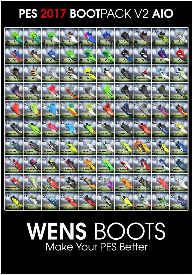 PES 2017 BootPack Full HD V2 (AIO) by Wens - новый пакет актуальных бутс в HD качестве и HQ текстурах, для футбольного симулятора Pro Evolution Soccer 2017