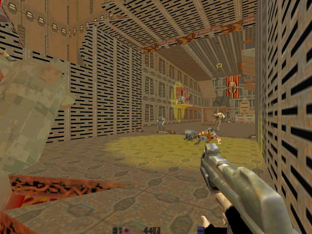 Кстати, стандартный движок Quake 2 не поддерживает движущиеся и вращающиеся прозрачные браши на объектах. Я это давно проверял, хотел сделать артиллериста с пушкой так, чтобы пушка была закрыта стеклянным куполом. Получилось только через kmquake. Могу даже показать на скриншоте...