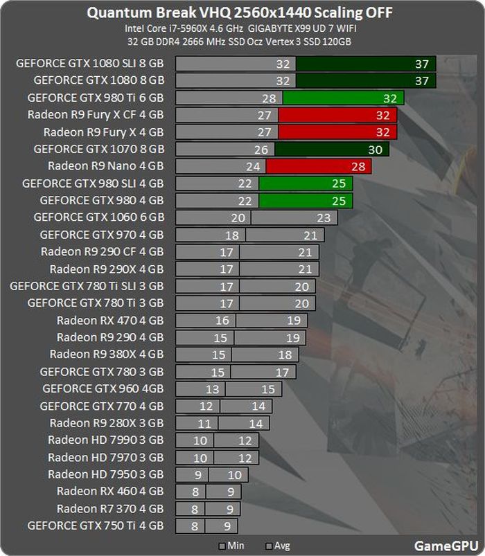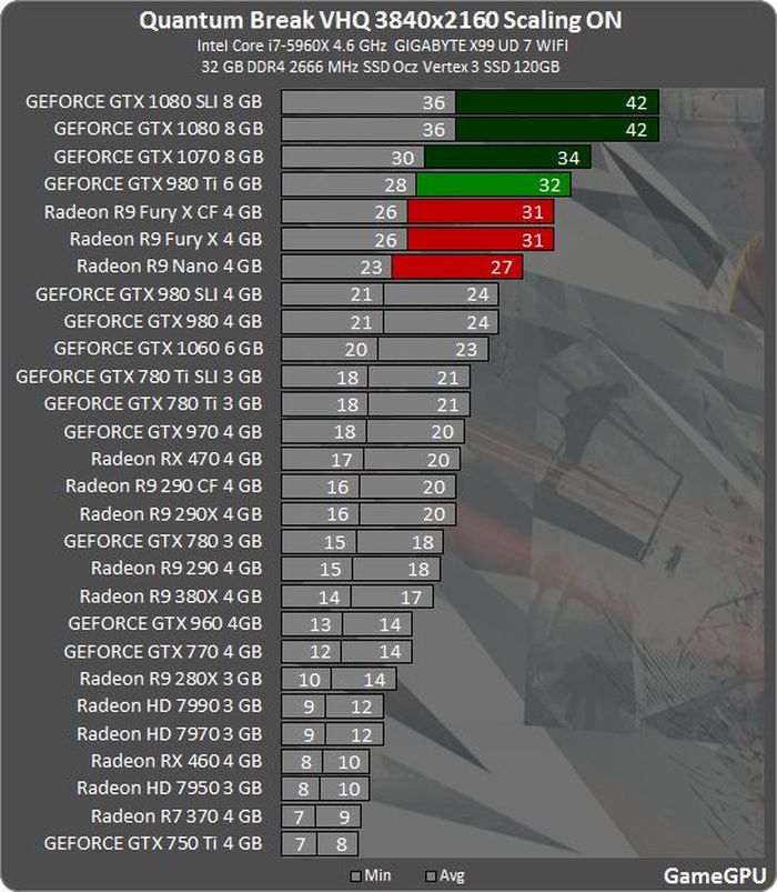 При данных настройках приемлемый показатель FPS показали видеокарты уровня Radeon R9 Nano или GeForce GTX 980. Оптимальными решениями станут видеокарты уровня Radeon R9 Fury X или GeForce GTX 1070 .