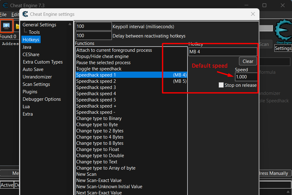 - Отыщите параметр Speedhack 1 и установите ему скорость на 1, что будет равно оригинальной скорости кат-сцен. В этом же окне назначьте горячую клавишу для использования команды (можно использовать дополнительные кнопки мыши или клавиатуру).