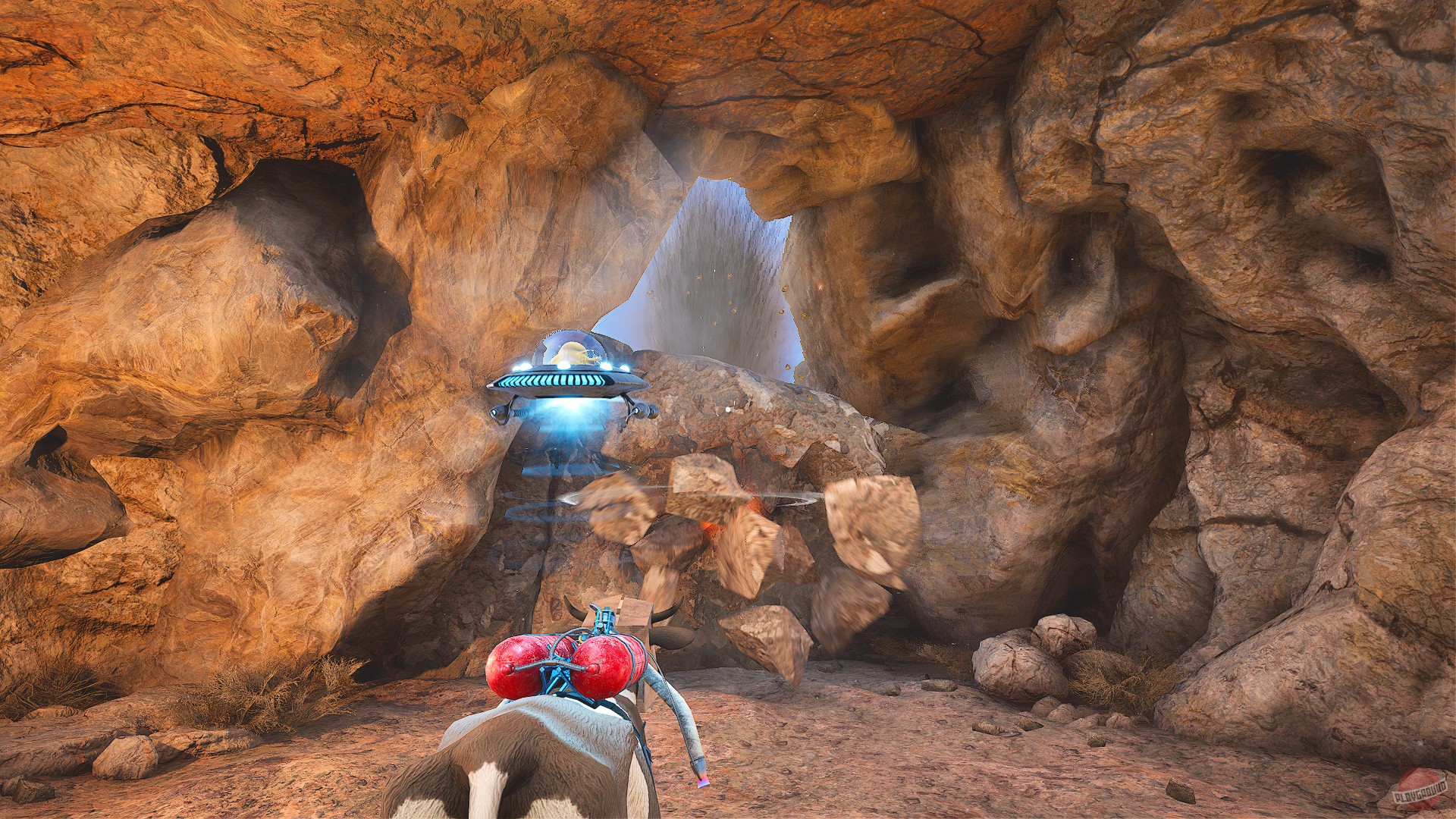 Инопланетный компаньон тоже не просто так болтается рядом — пока корова занимается своими бодательно-жевательными делами, НЛО может хватать предметы магнето-лучом, поджигать что-то плазмо-пушкой или бить врагов электрошокером. Всё это позволяет решать головоломки, где нужно использовать свойства окружения — вес, горючесть, электропроводность.
