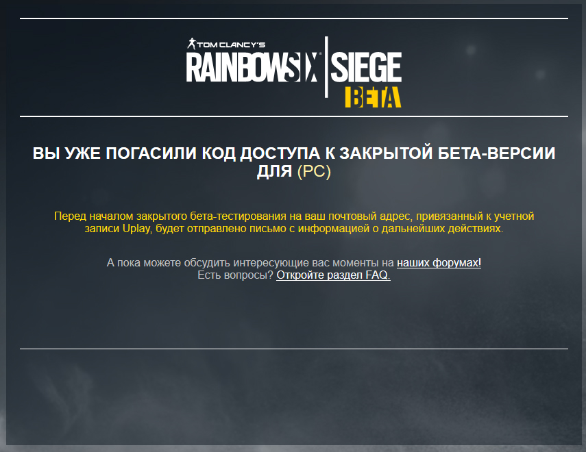 Нам очень жаль узнать, что Вы до сих пор не получили код для участия в Бета-тестировании Rainbow Six: Осада. В данный момент мы находимся в процессе начисления беты на аккаунты наших пользователей. Мы рекомендуем Вам ознакомится с информацией на нашем официальном блоге:
