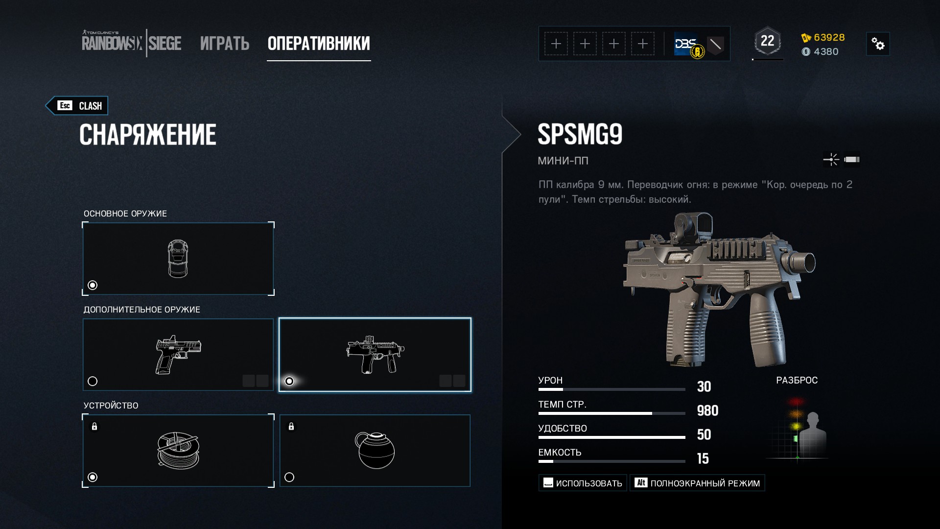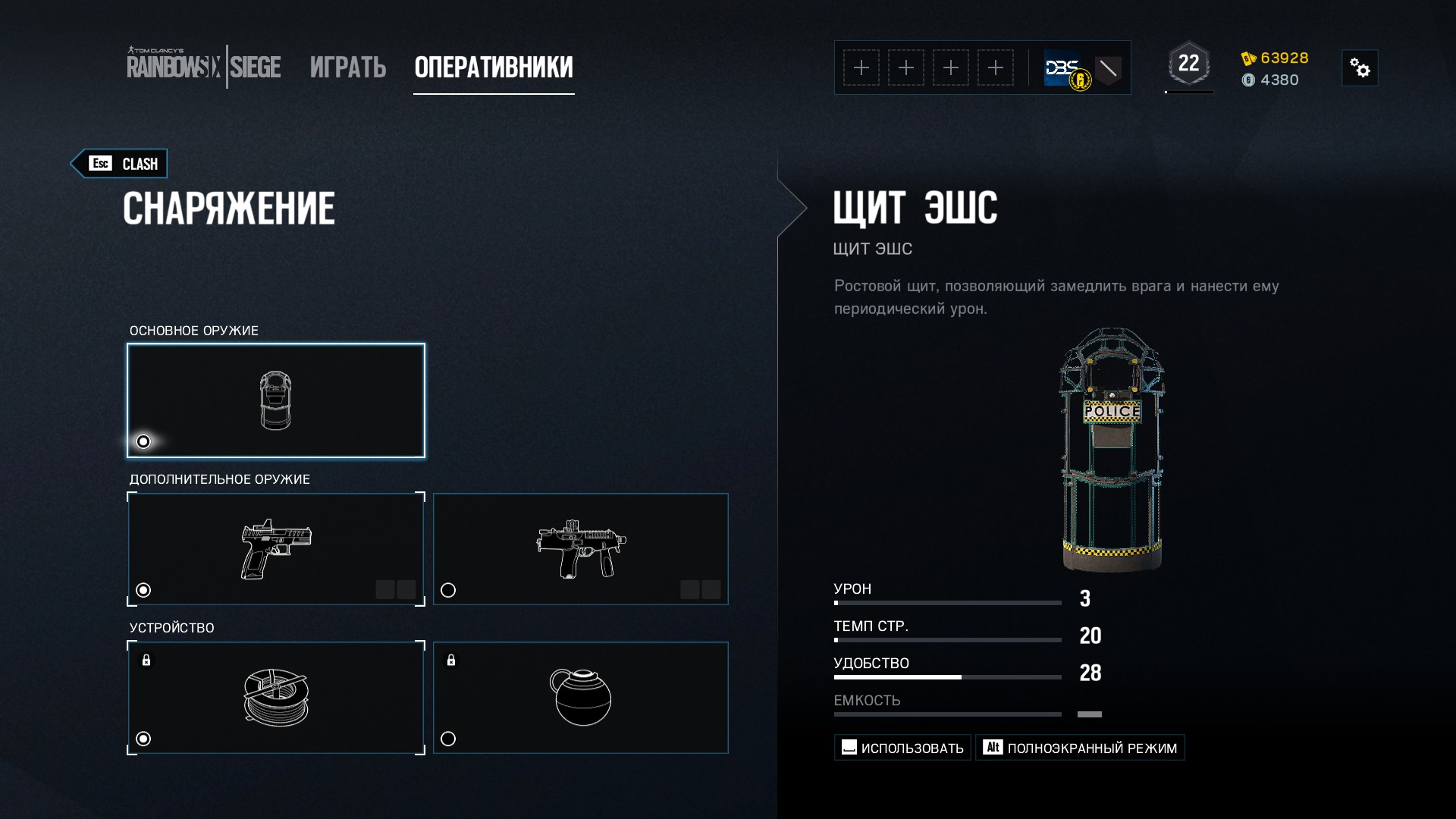 Clash — 1-й защитник, в снаряжении которого есть особый щит. Он станет основным оружием оперативника: чтобы использовать пистолет, устройство придется убрать. В пулестойкий щит ЭШС встроен генератор заряженного поля (ГЗП), возникающего перед щитом и позволяющего замедлять противников, а также наносить им незначительный урон. Благодаря этому девайсу Clash может заблокировать проход и таким образом задержать врага или вовсе сорвать штурм.