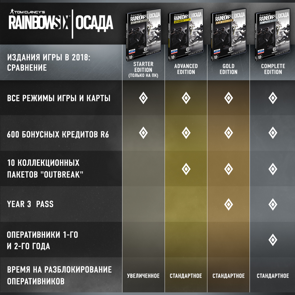 Advanced Edition, Gold Edition и Complete Edition для PlayStation 4, Xbox One и PC поступят в продажу 13 февраля. В Advanced Edition войдут все карты и режимы, стандартная система разблокирования оперативников, дополнительные 600 кредитов R6 и 10 пакетов Outbreak. Gold Edition включает в себя то же самое и сезонный пропуск третьего года сверху. Наконец, самое пухлое издание называется Complete Edition — купив его, помимо вышеперечисленного вы получите всех дополнительных оперативников, добавленных в игру за два года.