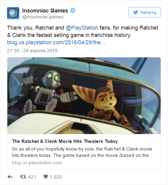 Официальный твиттер студии Insomniac Games сообщает - вышедший 20 апреля Ratchet & Clank стал самой быстропродаваемой частью серии, превзойдя результаты всех предыдущих игр серии (а их, на секундочку, с 2002 года вышло четырнадцать штук).