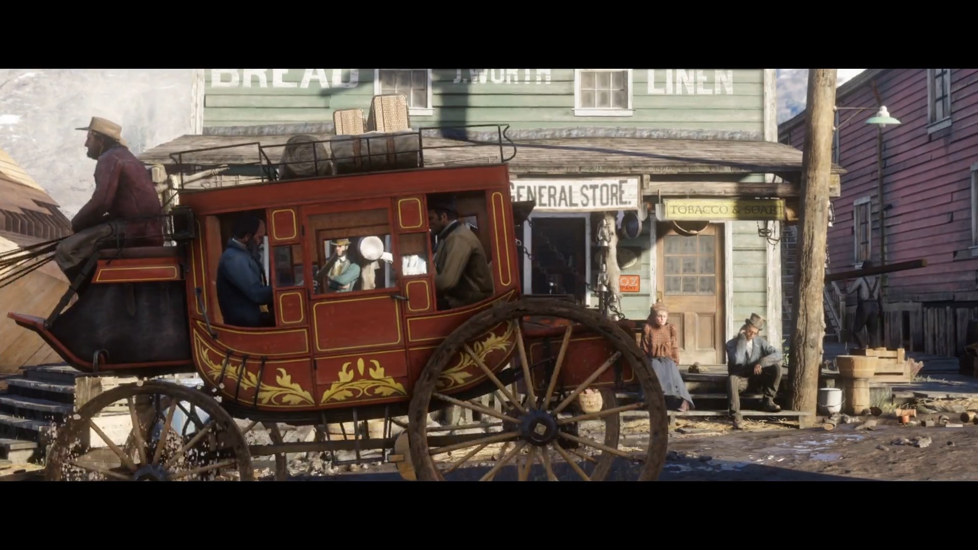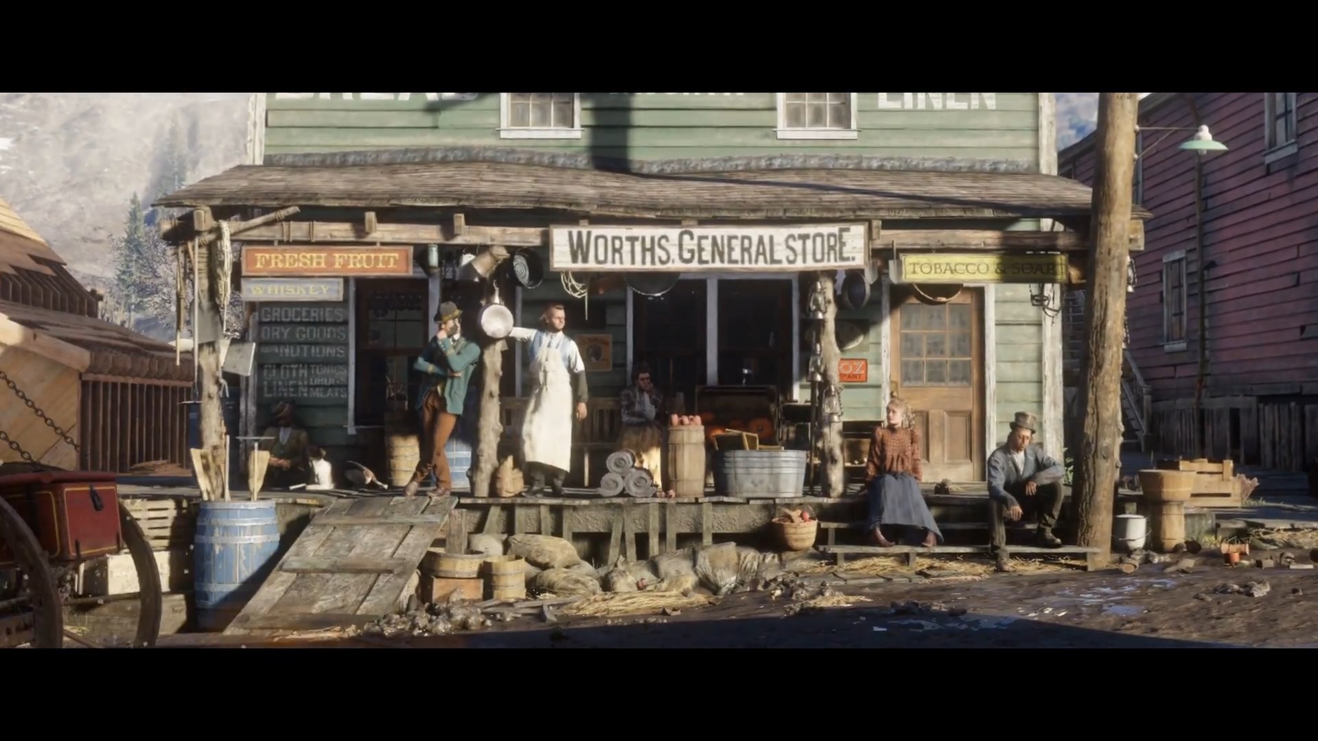 На 38й секунде трейлера мы видим проезжающую карету с людьми, и когда она полностью проедет, то дальше мы можем заметить магазин "Worths General Store" что в переводе означает "Главный магазин", в котором можно приобрести (судя по левой вывеске на табло) свежие фрукты, виски и другие вещи. Справа тоже есть магазин который носит название "Tabacco" в котором можно приобрести табак. Обратите кстати внимание насколько тут живые люди, в буквальном смысле живые, анимация просто впечатляет, и даже не говорите что это тоже самое что и было в Gta V, нет, не тоже самое, тут видна хорошая проработка моделей, новая отличная анимация. Идём дальше.