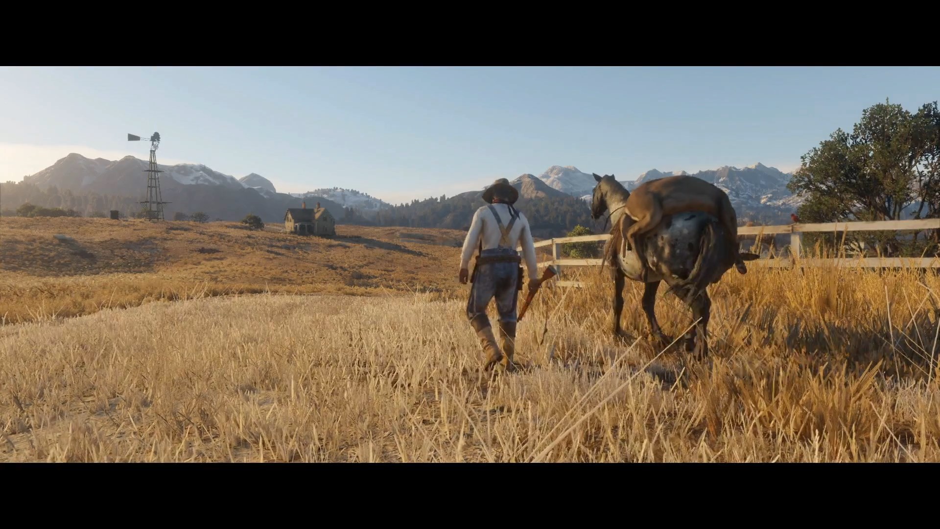 На 31й секунде трейлера мы видим возможно главного героя идущего по полю вместе с лошадью, кстати обратите внимание что на лошади свисает тело животного, теперь становится понятно что в игре можно будет охотиться на животных, это будет что то вроде квестов или же это можно будет делать самому, но сам факт того что это будет в игре просто впечатляет. Впереди мы видим маленький домик и вышку с левой стороны. Так же видно что наш главный герой вооружён, и если я не ошибаюсь то он как раз возвращался с охоты и добычу можно будет складывать на лошадь, а что делать потом это мне пока что не известно. Идём дальше