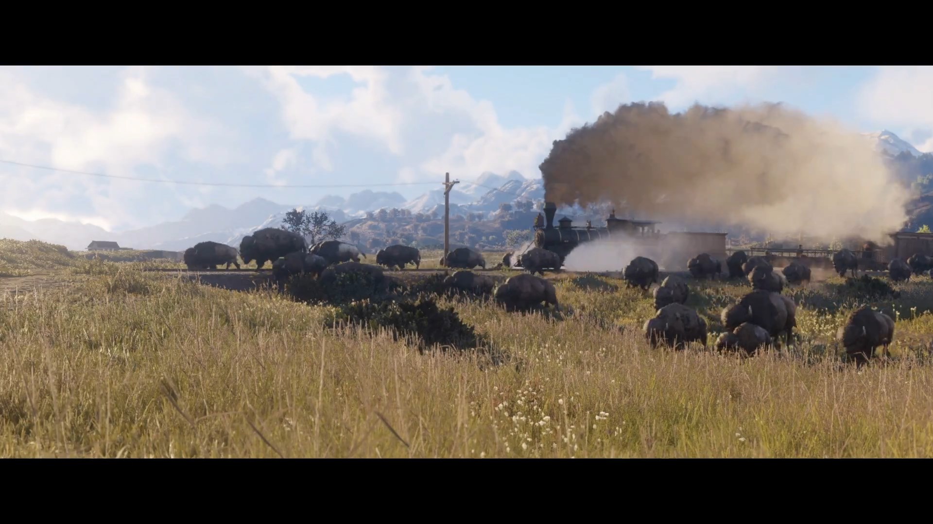 На 36й секунде мы можем видеть поезд и мчащихся вдоль него зубров, возможно их испугал идущий мимо поезд, зубры как и другие животные будут присутствовать в игре, это очень радует. И опять можно обратить внимание что травы тут просто много, я конечно может быть слишком зациклен на этом, но вы только гляньте сколько её тут! Везде трава, почти повсюду, обычно в играх её бывает мало или вообще не бывает, да и сделана она тут очень хорошо и качественно. Идём дальше